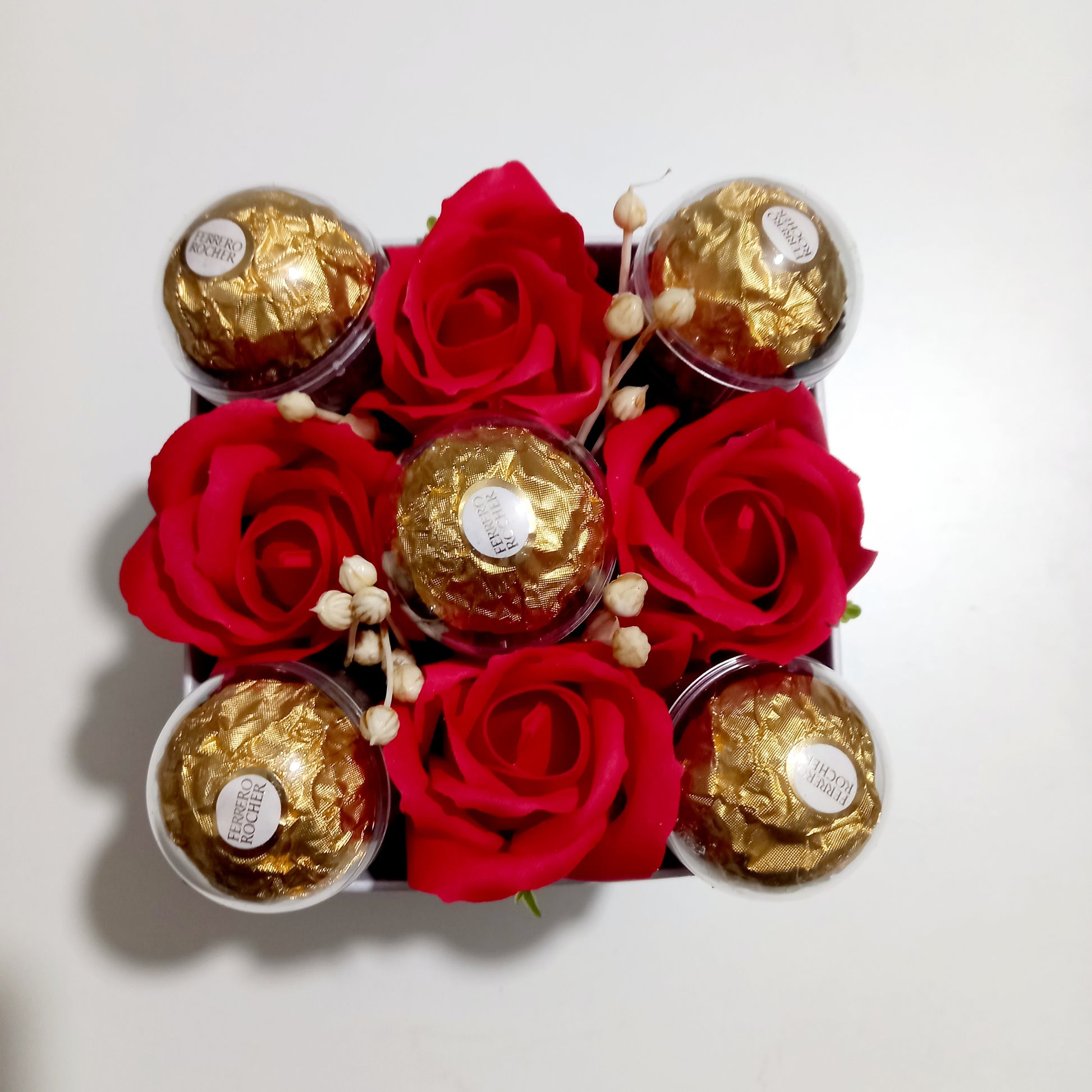 Caixa vaso com 4 rosas de sabão e 5 Ferrero Rocher
